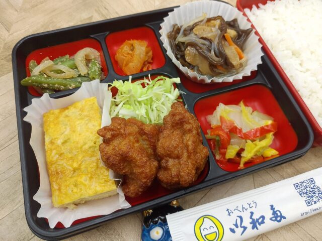 若鶏唐揚【鶏肉、でん粉、大豆油、醤油、小麦粉、生姜、大豆たん白、パン粉、砂糖、にんにく、食塩、酒、こしょう、ブドウ糖、こんにゃく粉/リン酸(Na)、調味料(アミノ酸)、pH調整剤、増粘剤(カラギナン)、膨張剤、トレハロース】(一部に小麦、大豆、鶏肉を含む)、白絞油