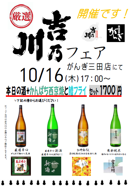 10月16日 木曜日 17時~ がんぎ三田店(のみ)にて