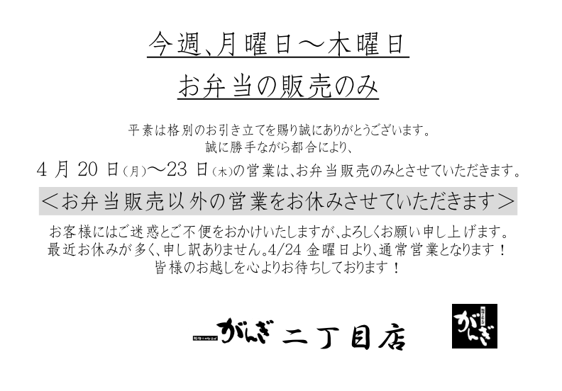 がんぎ二丁目店 4月20日~23日の営業時間について